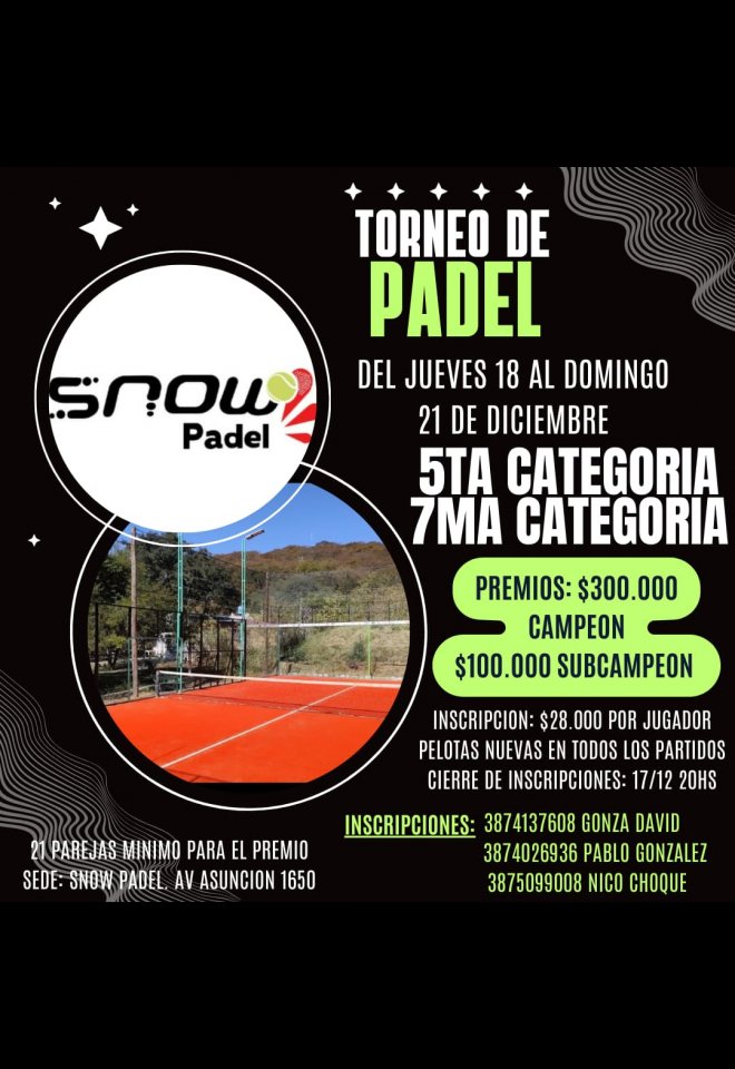 »» Evento: Torneo de Padel SNOW »» Localidad: Salta »» Fechas: 18/12/2025 al 21/12/2025